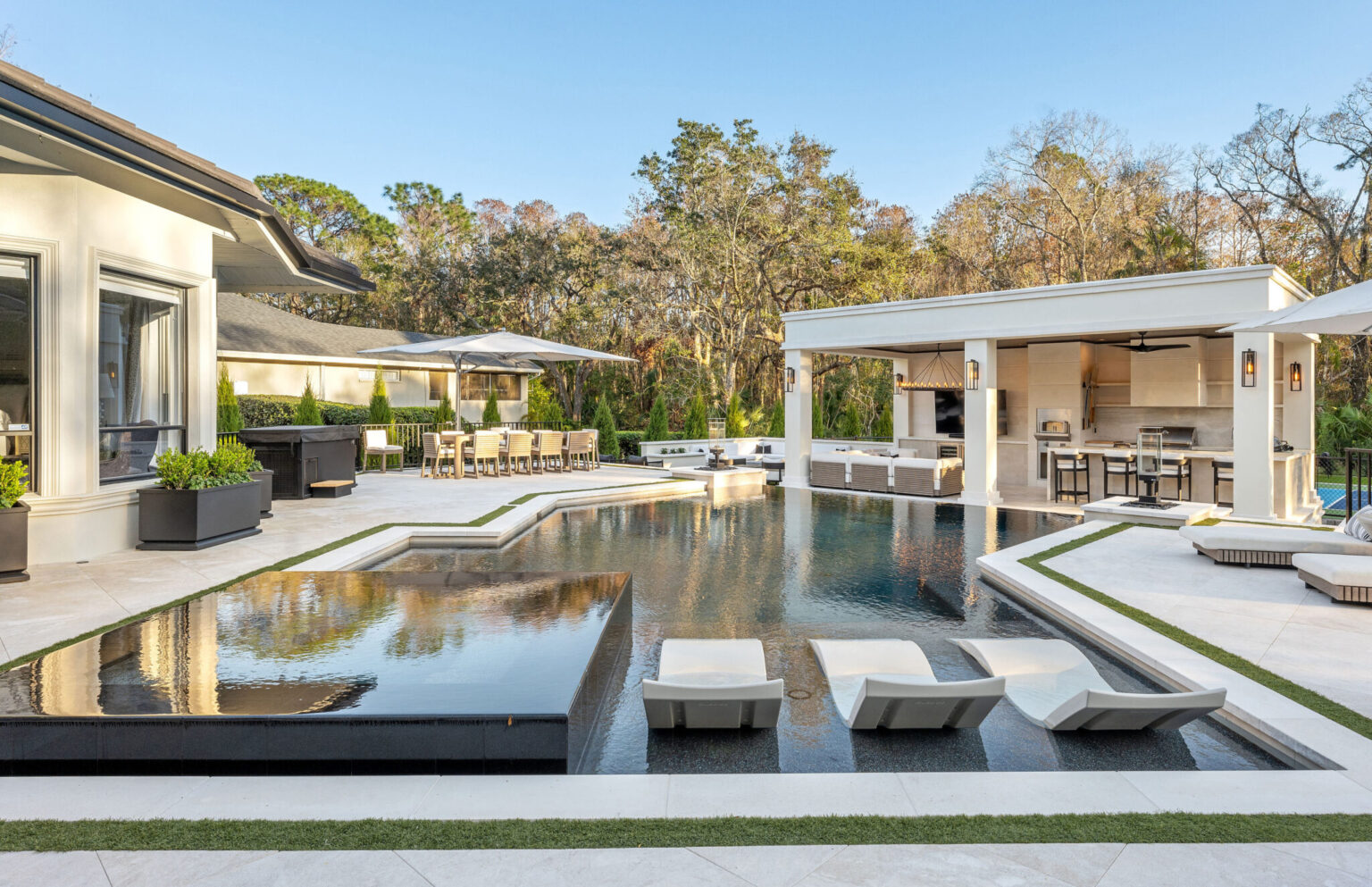 In many high-end projects, poolhouses and pavilions contribute significantly to privacy. Fully enclosed poolhouses—now one of the fastest-rising trends—serve as architectural anchors that naturally block lines of sight. They provide a protected interior for year-round use while shaping circulation and creating private pockets around terraces and water features.